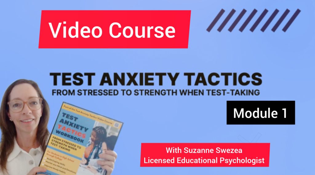 Struggling with test anxiety doesn’t have to take lots of time or months of therapy. Test Anxiety Tactics is a workbook and video course that was created for students like YOU! Written and created by Suzanne Swezea M.S., Licensed Educational Psychologist #4559, Test Anxiety Tactics puts Suzanne’s 19 years of counseling students with disabilities to use helping students specifically with Test Anxiety.