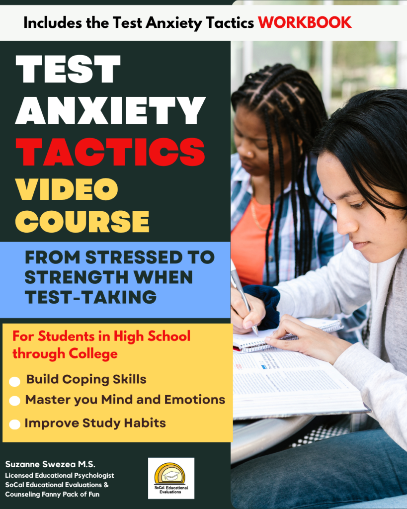 Struggling with test anxiety doesn’t have to take lots of time or months of therapy. Test Anxiety Tactics is a workbook and video course that was created for students like YOU! Written and created by Suzanne Swezea M.S., Licensed Educational Psychologist #4559, Test Anxiety Tactics puts Suzanne’s 19 years of counseling students with disabilities to use helping students specifically with Test Anxiety.